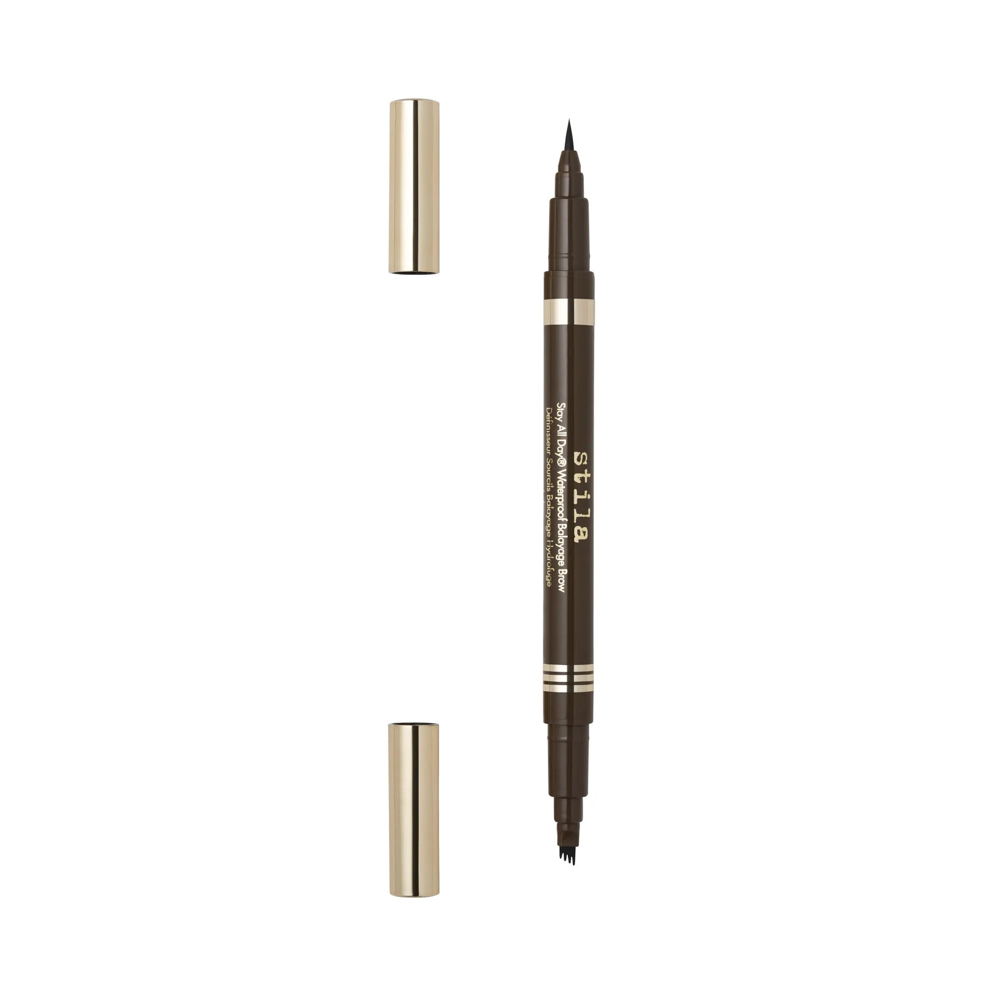 Stila innovative, double-ended brow pen features two complementary shades to expertly sculpt and fill in eyebrow hairs for natural-looking, flawless eyebrows. One side of the pen includes the precise Stay All Day® Waterproof Brow colour felt-tip applicator to draw hair-like strokes, while the other side contains a 4-prong brow applicator to fill in and blend colour into brows. Smudge-proof, transfer-proof, sweat-resistant and waterproof, this 2-in-1 tool allows you to easily shape, style and define brows and achieve amazing balayage-brow effects with a flawless, airbrushed finish that lasts from sunrise to moonlight.